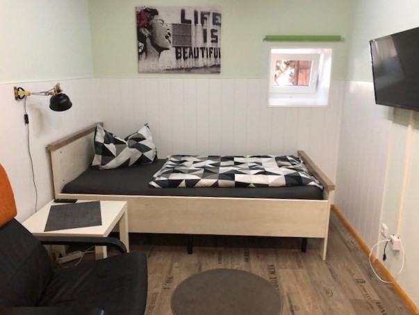 Unser Angebot ist bezüglich der Ausstattung und der Preise vergleichbar einer Studentenwohneinrichtung bzw. einem Boardinghouse. Die Räume haben eine Größe zwischen 11 und 12 qm und eine freundliche und moderne Ausstattung ohne unnützen Schnickschnack, aber mit allem, was Gäste in der Vergangenheit bei uns nachgefragt haben. Die Einrichtung eines jeden Zimmers besteht aus einem Bett in Komfortgröße von 100x200m mit erstklassiger Matratze, einem bequemen Relaxsessel samt Beistelltisch, DVB-T-TV-Gerät sowie einem Garderobenpaneel. Ein Kleiderschrank war von den meisten bisher nie gewünscht, sofern Sie allerdings gern einen hätten, besorgen Sie sich einfach einen kleinen mobilen Faltschrank aus Stoff für kleines Geld. Stattdessen hat jedes Zimmer eine eigene Pantry (Kleinküche), damit Sie sich bezüglich Ihres Frühstücks und des Abendessens selbst versorgen können. Zur Ausstattung der Pantry gehört ein Kühlschrank, ein Heißwasserbereiter, das Kombigerät zum Kochen, Backen, Grillen sowie auch zum Erwärmen fertiger Gerichte oder alternativ eine Kochplatte, ein Pizza-Ofen, Toaster, Töpfe, Teller, Tassen und Besteck. Natürlich ist auch ein Essplatz in jedem Zimmer vorhanden. Möglich ist es bei Verfügbarkeit, unseren Wi-Fi-Hotspot zu nutzen. Auf dem Korridor der Wohnung befinden sich innerhalb der Sanitärzeile neben dem Spültisch auch ein Waschvollautomat und ein elektrischer Trockner sowie die 4 Müll-Trennungsbehälter.